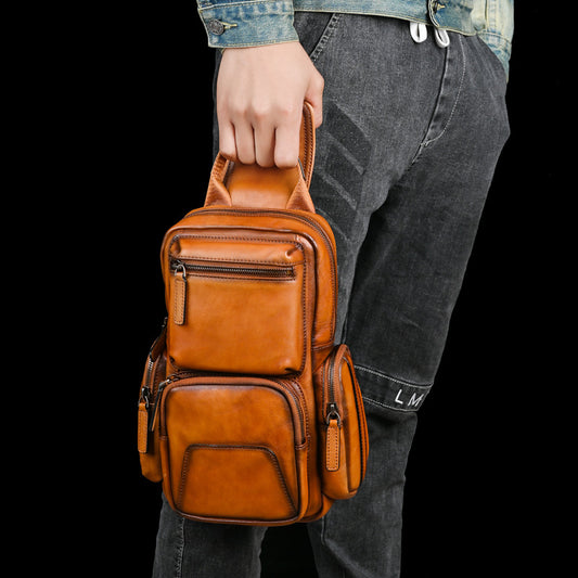 メンズバストバッグ牛革本革製レトロカジュアル男性用斜めがけバッグ
