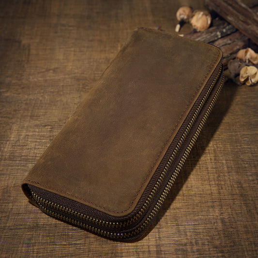 メンズ長財布オリジナルクレイジー・ホース牛革本革製ダブルファスナーカード入れ大容量レトロ男性用クラッチバッグハンドバッグ