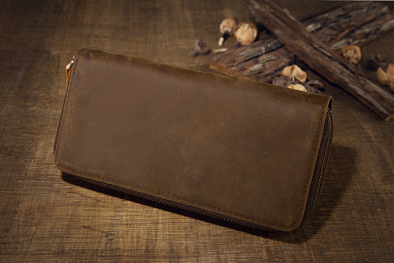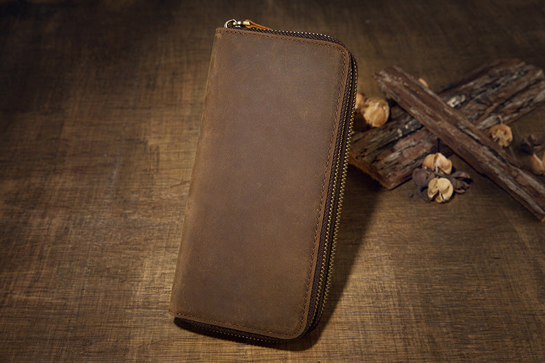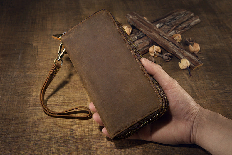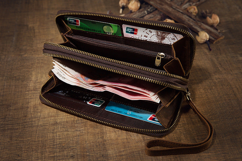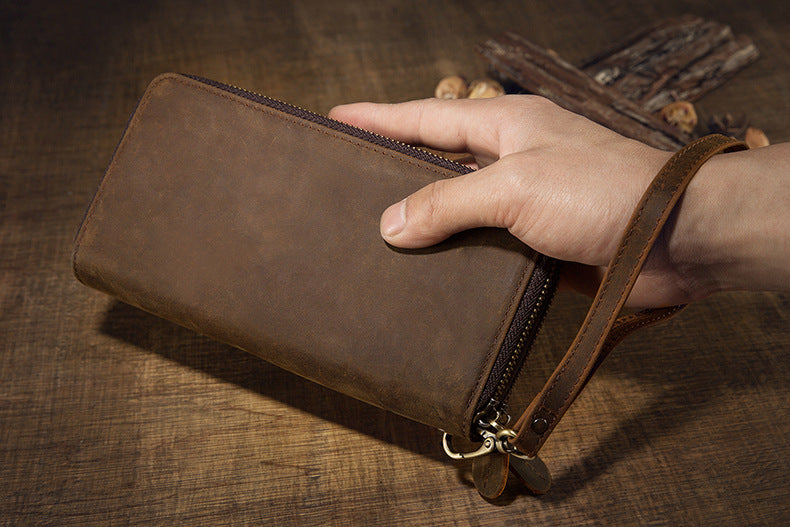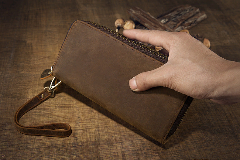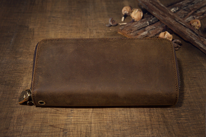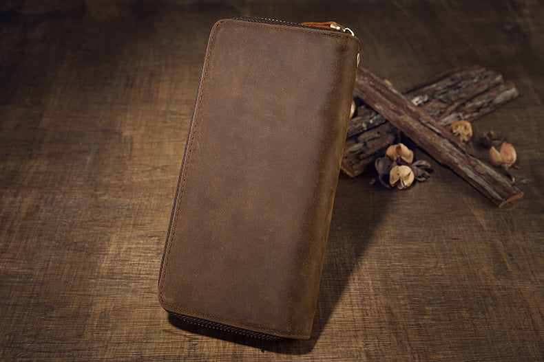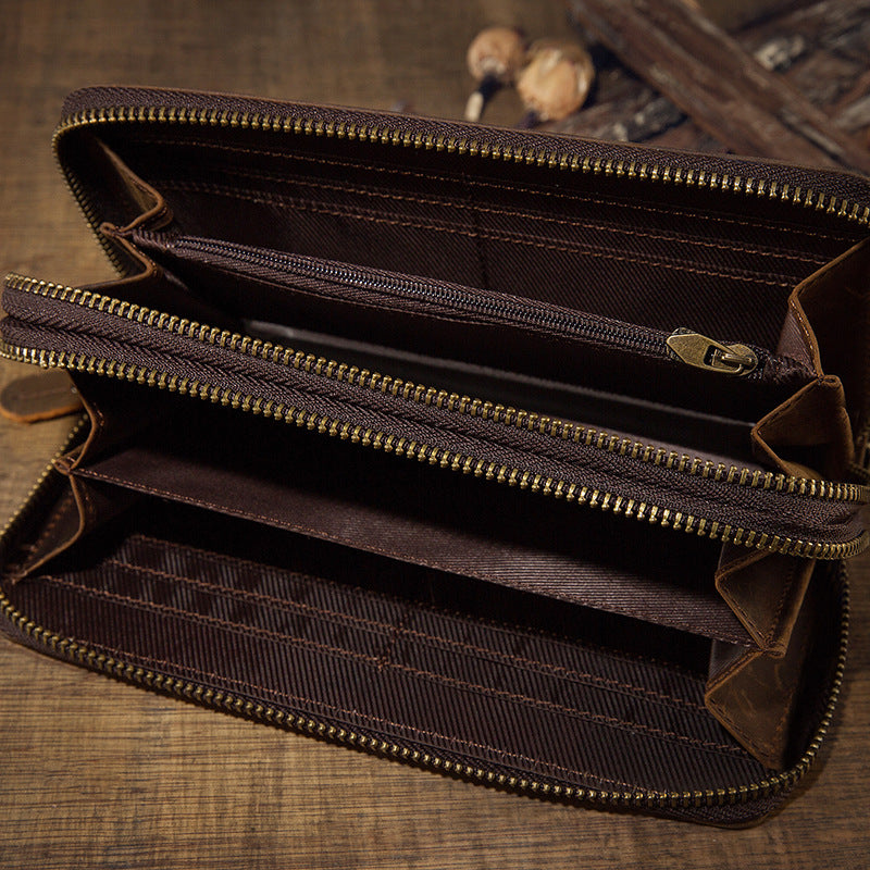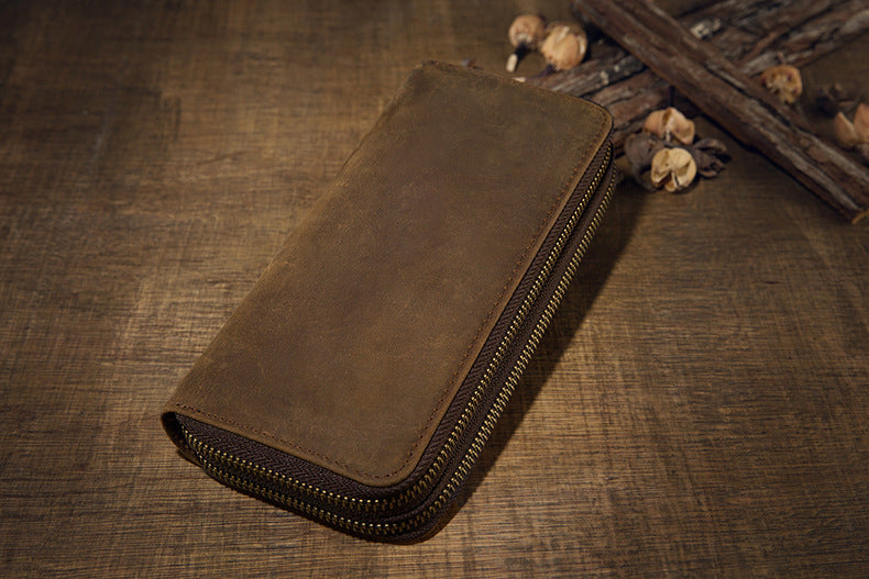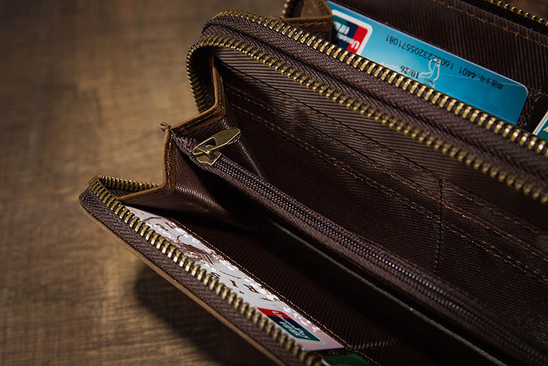 メンズ長財布オリジナルクレイジー・ホース牛革本革製ダブルファスナーカード入れ大容量レトロ男性用クラッチバッグハンドバッグ