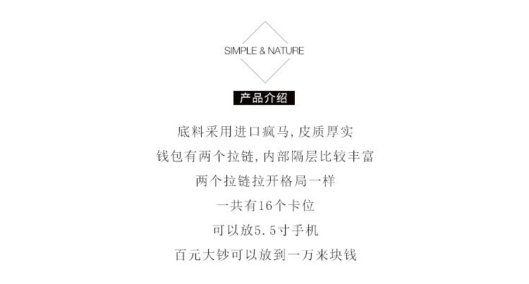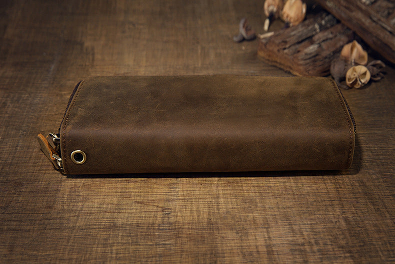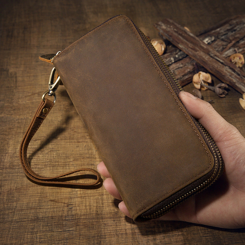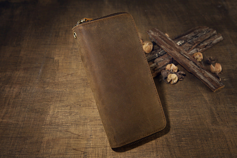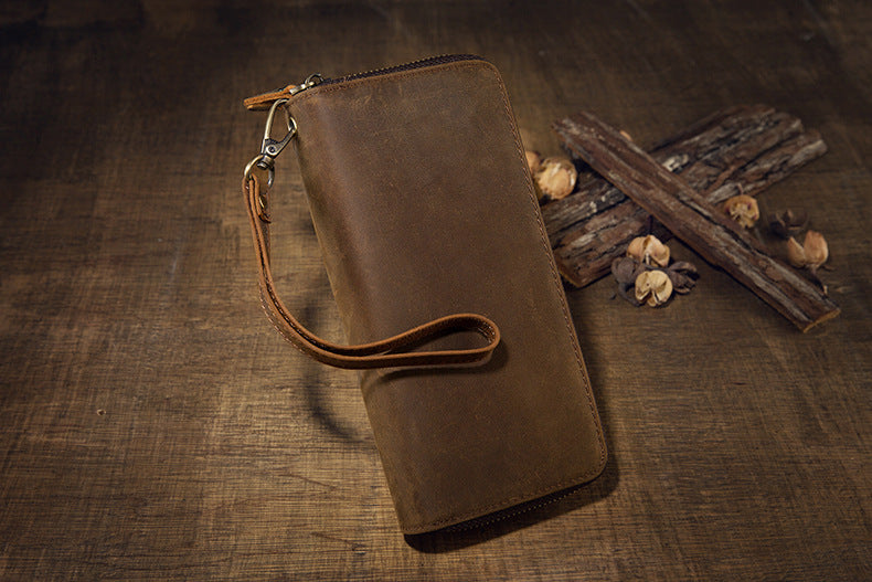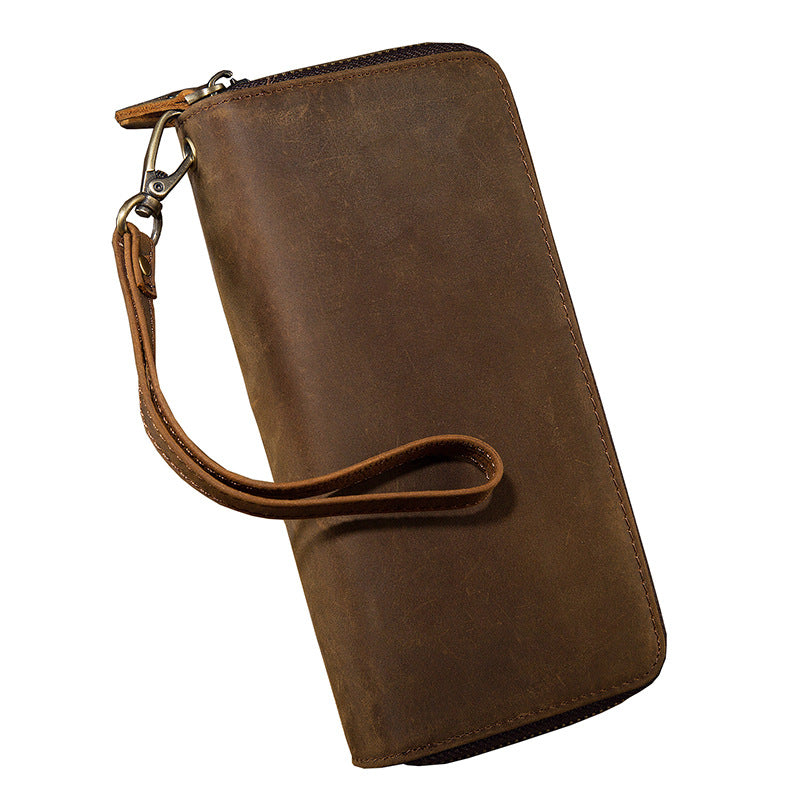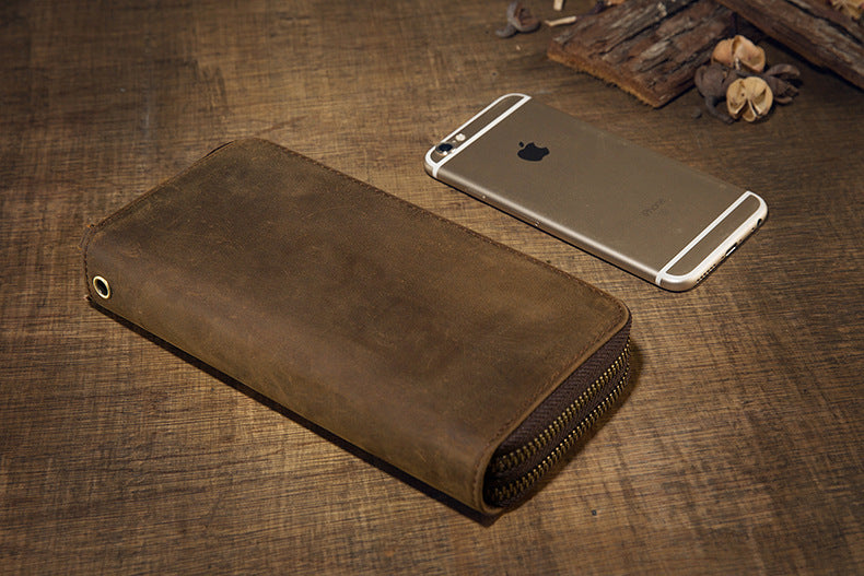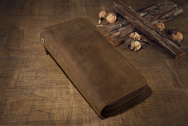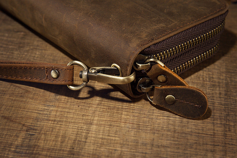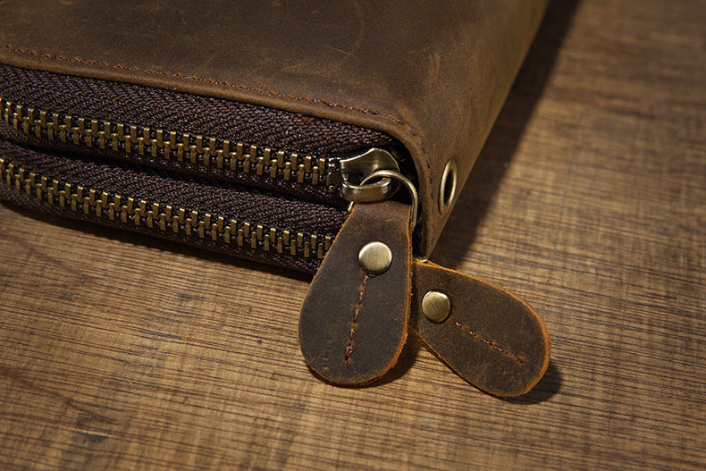 メンズ長財布オリジナルクレイジー・ホース牛革本革製ダブルファスナーカード入れ大容量レトロ男性用クラッチバッグハンドバッグ