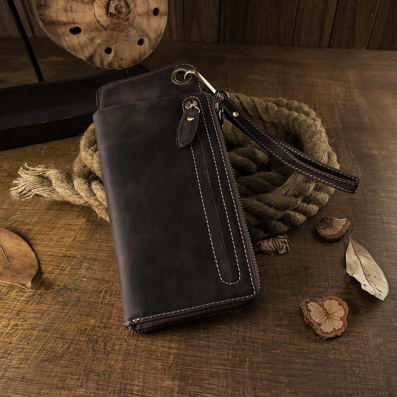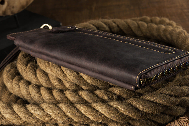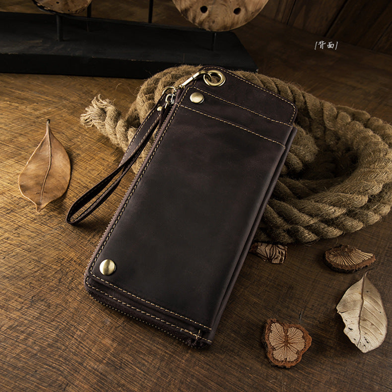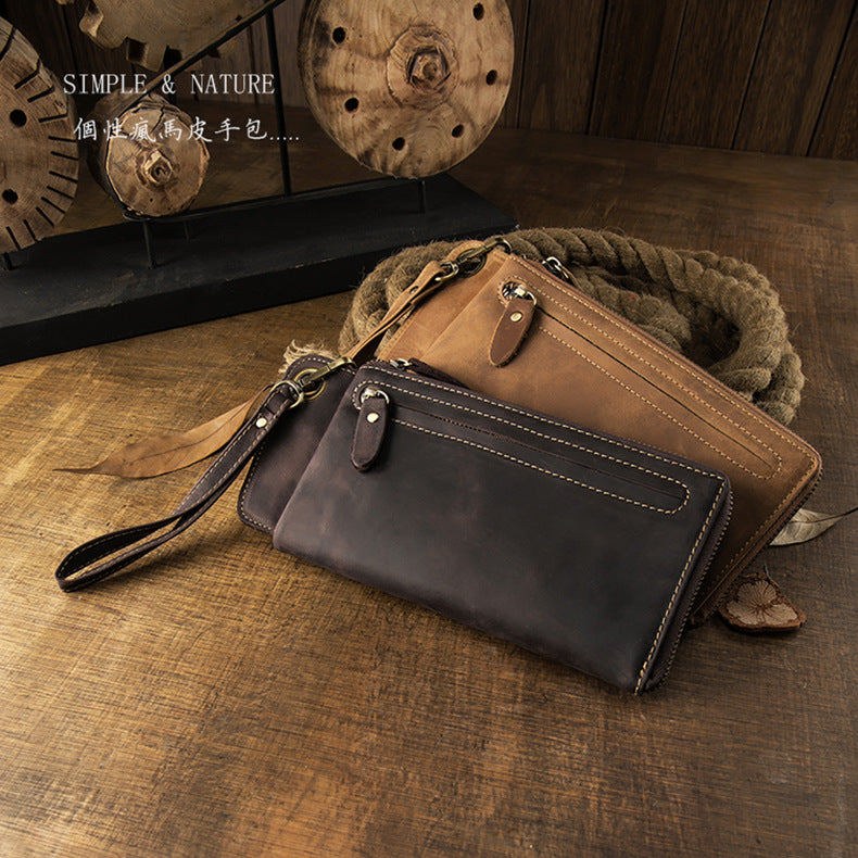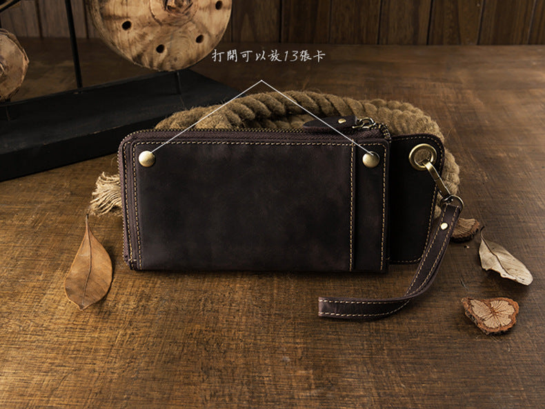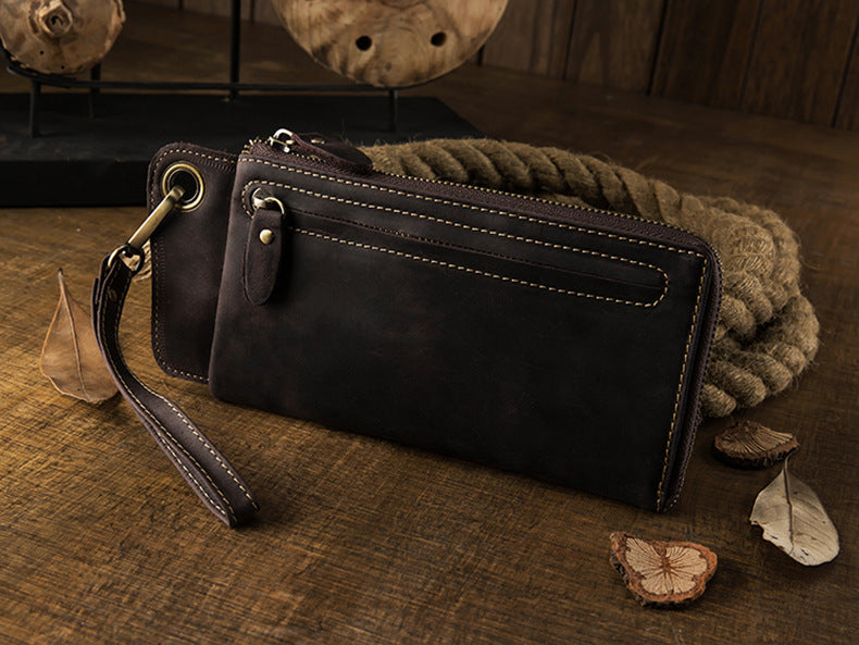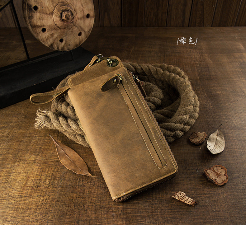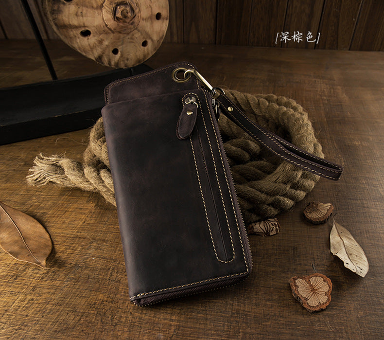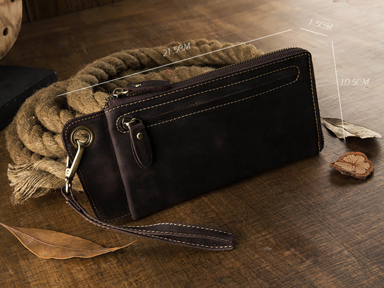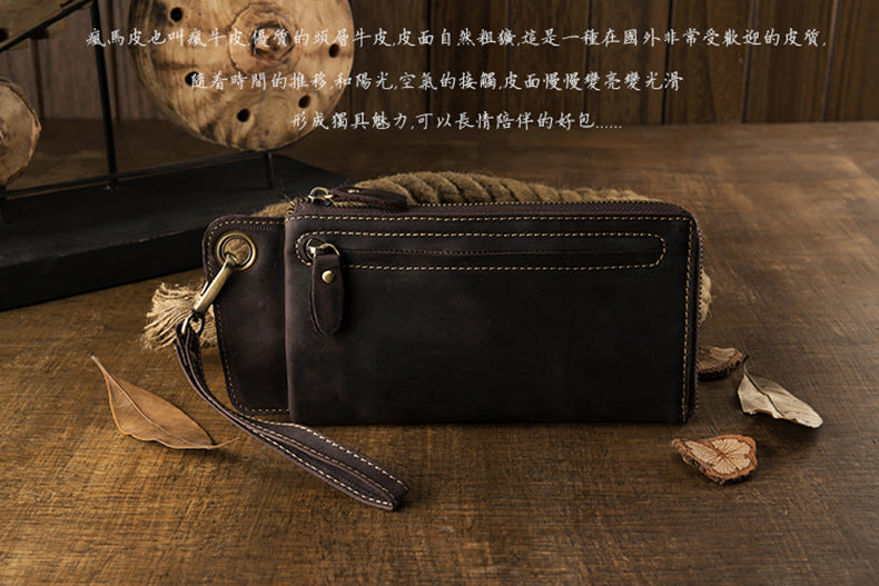 メンズ長財布手作業牛皮本革製クレイジー・ホースレトロカードバッグ大容量ファスナー男性用ウォレット携帯電話バッグ