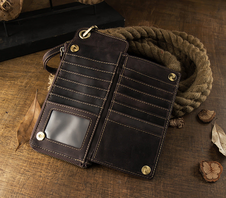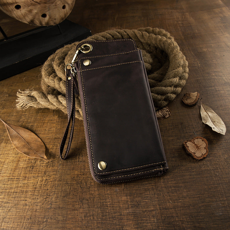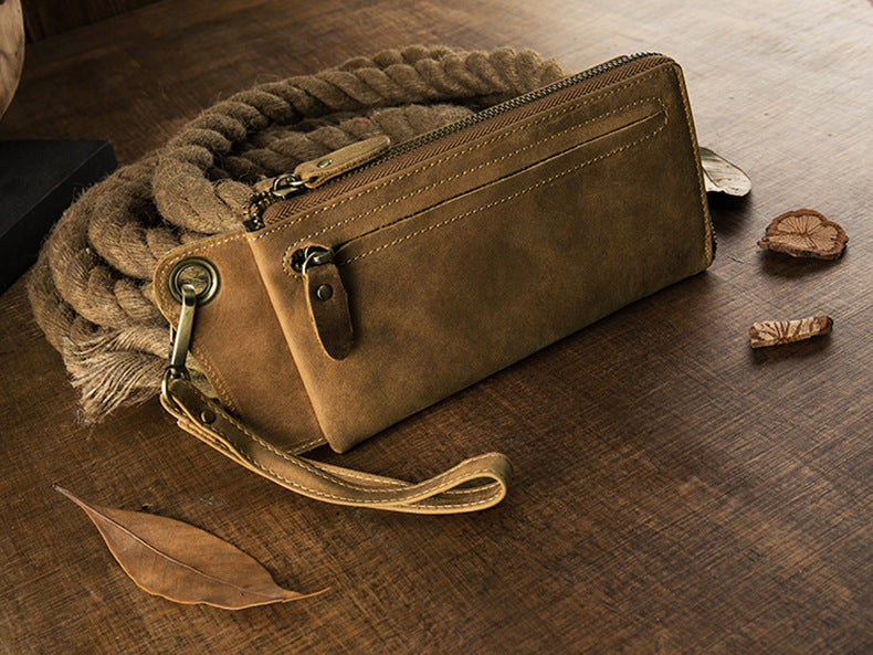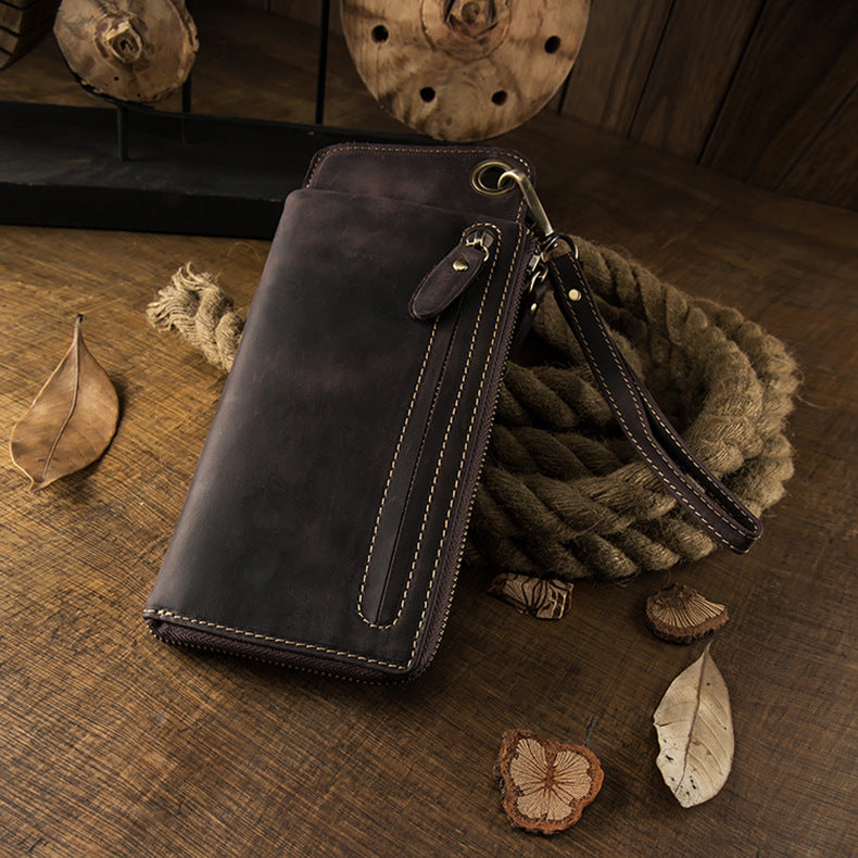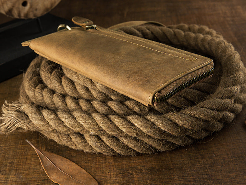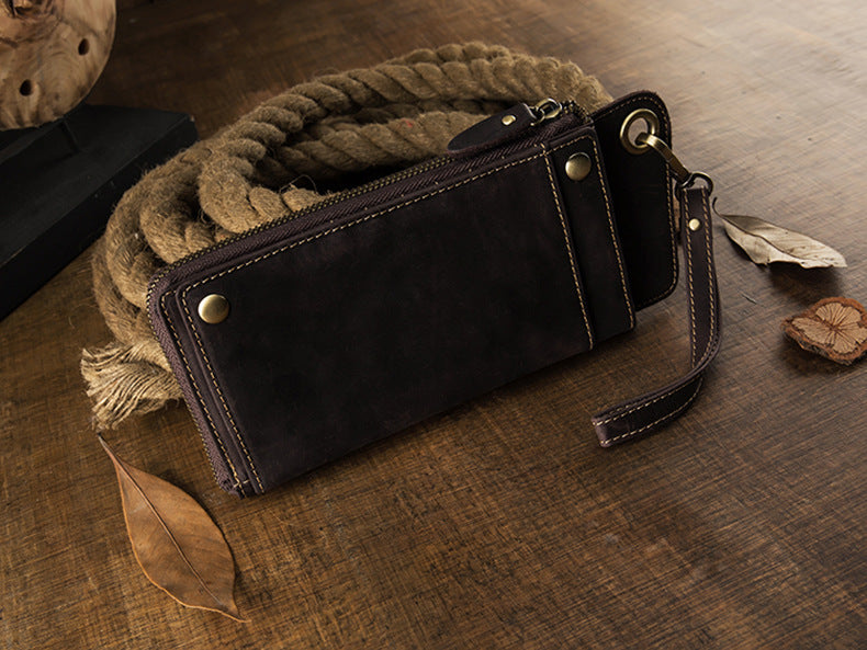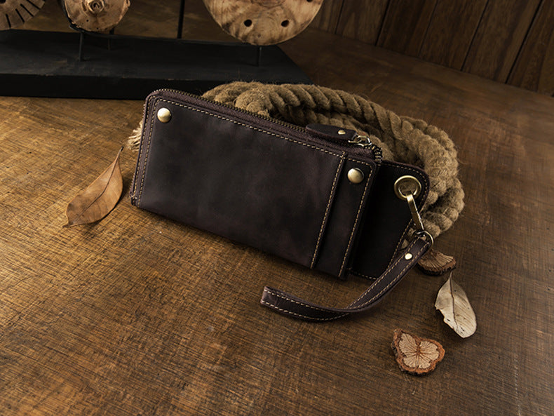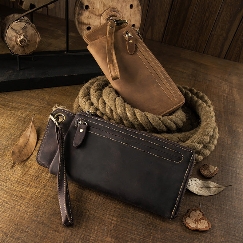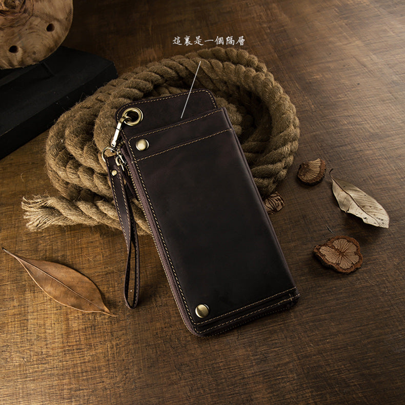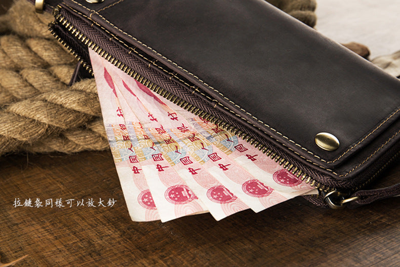 メンズ長財布手作業牛皮本革製クレイジー・ホースレトロカードバッグ大容量ファスナー男性用ウォレット携帯電話バッグ