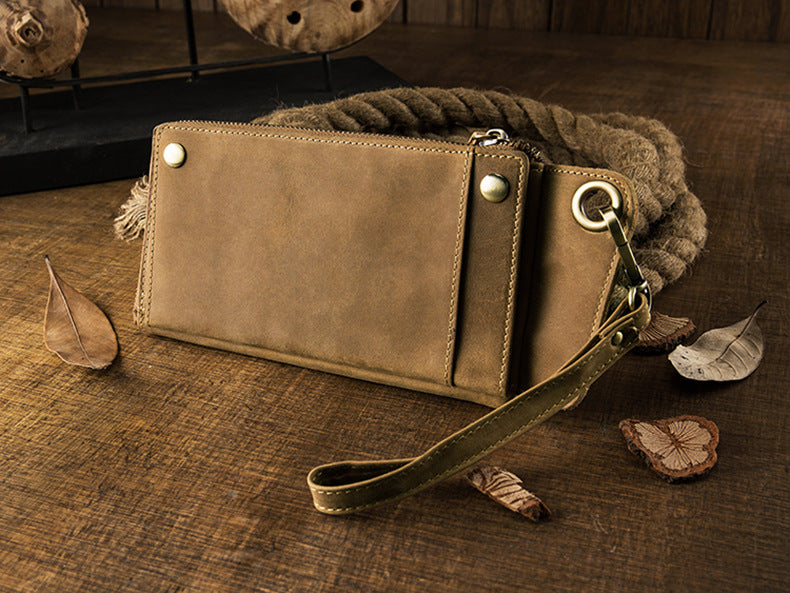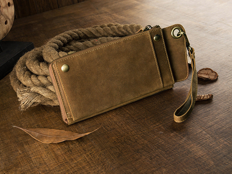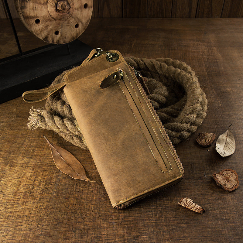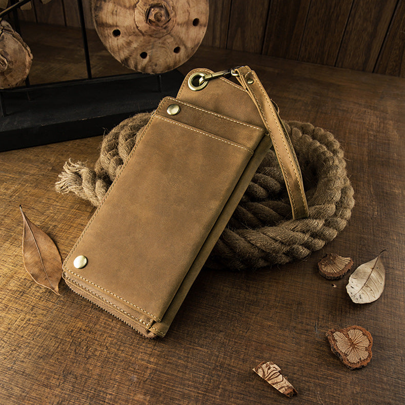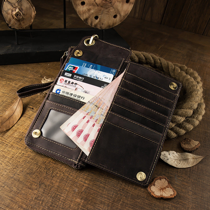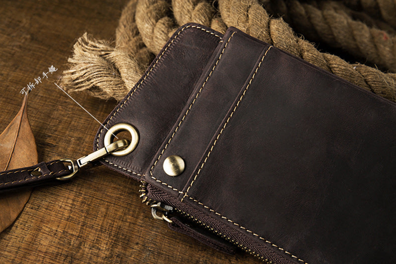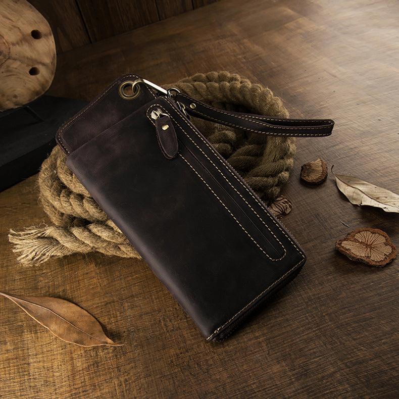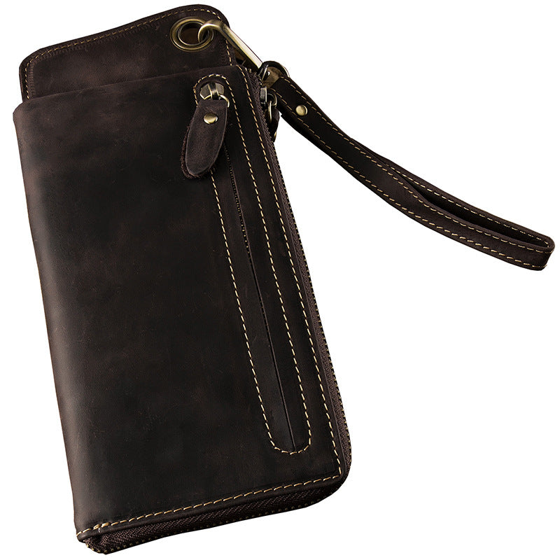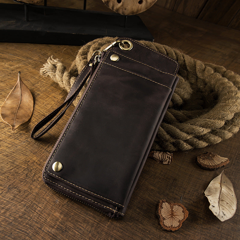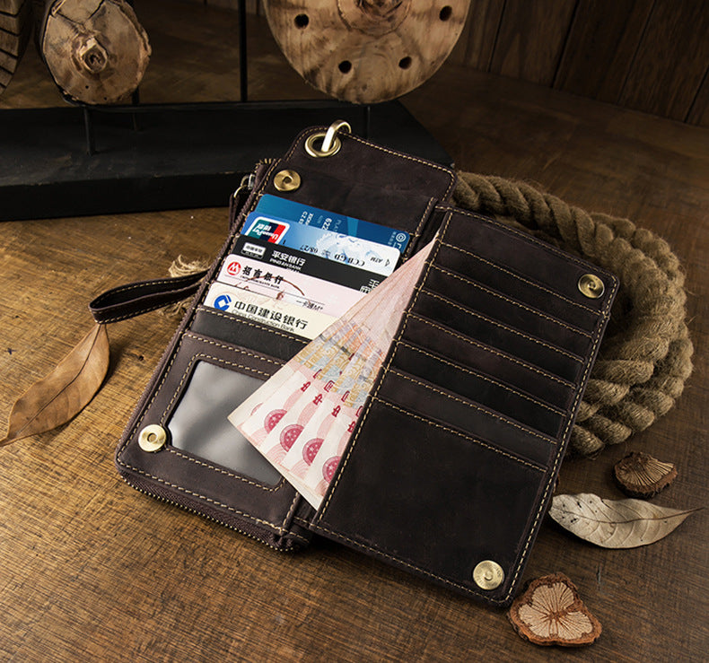 メンズ長財布手作業牛皮本革製クレイジー・ホースレトロカードバッグ大容量ファスナー男性用ウォレット携帯電話バッグ