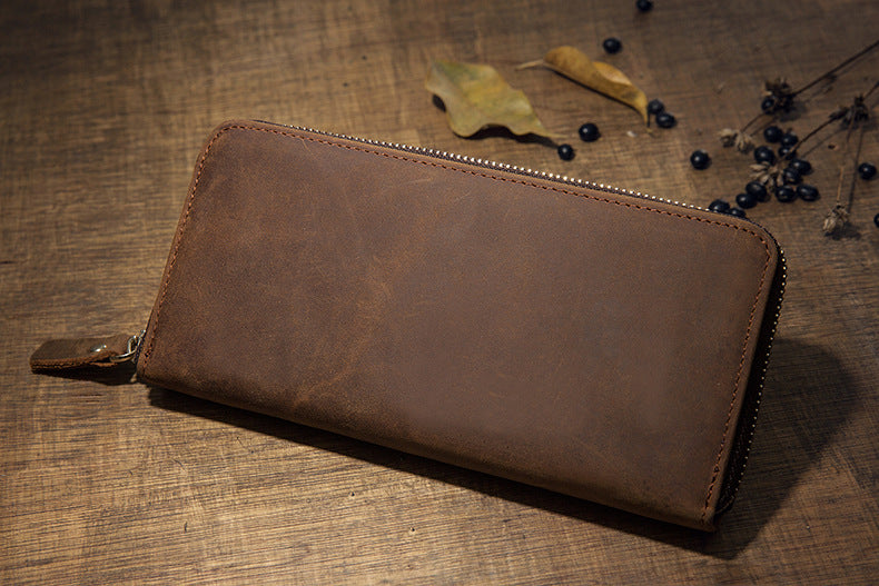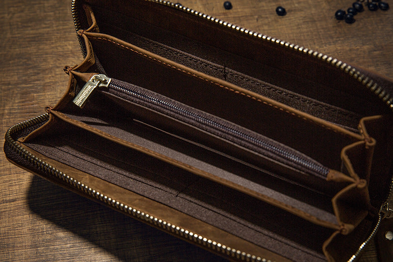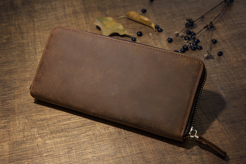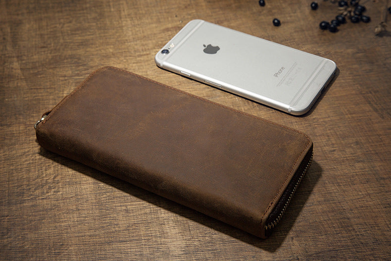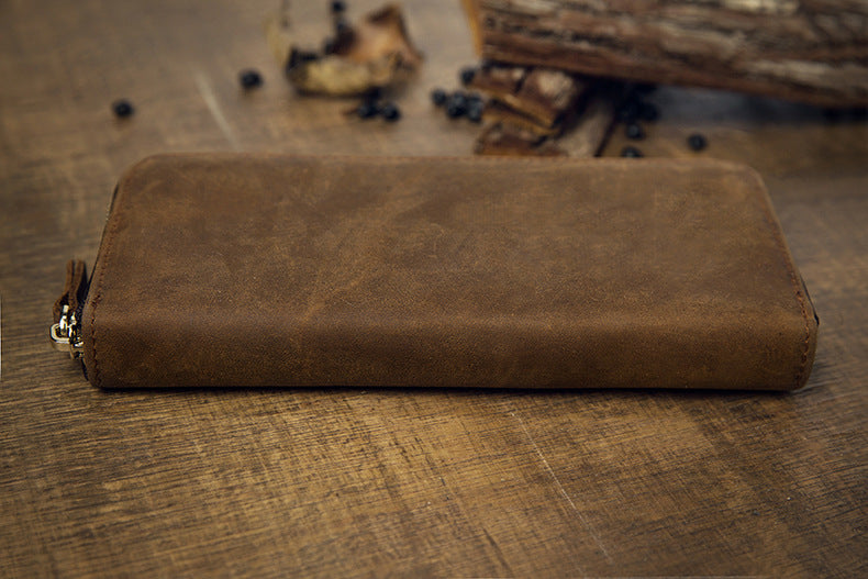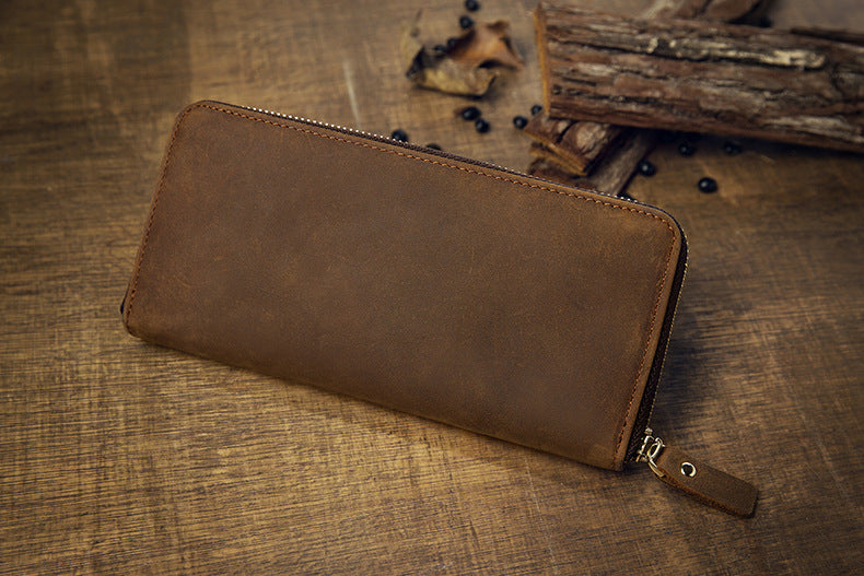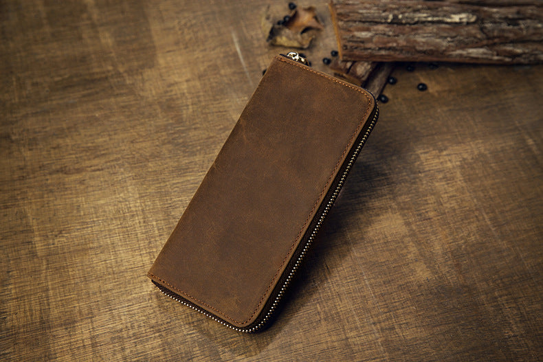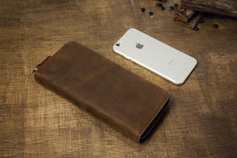 メンズ長財布 牛皮本革製 クレイジー・ホース 手作業 ファスナー レトロシンプルカジュアルクラッチバッグ男性用ウォレット 携帯電話バッグ