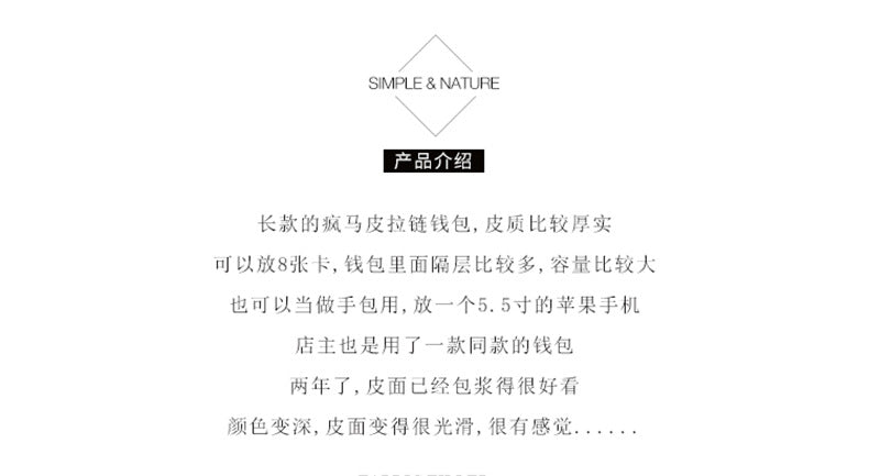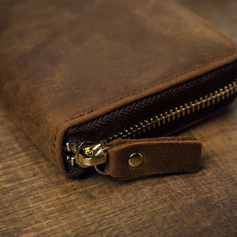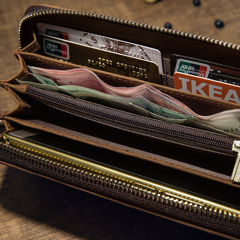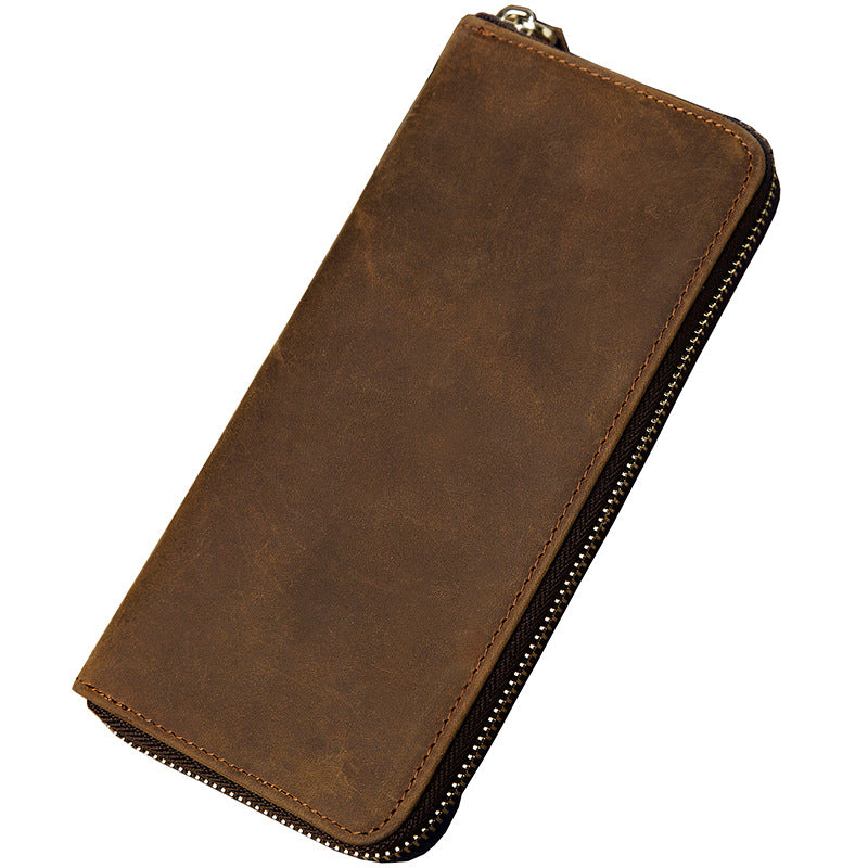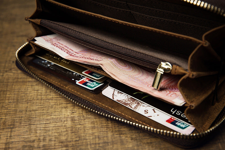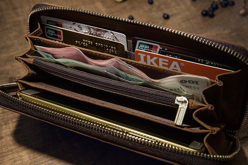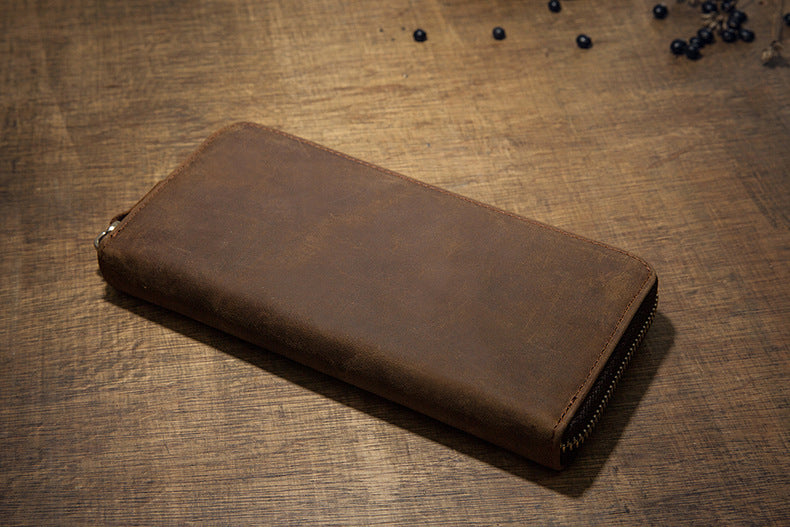 メンズ長財布 牛皮本革製 クレイジー・ホース 手作業 ファスナー レトロシンプルカジュアルクラッチバッグ男性用ウォレット 携帯電話バッグ