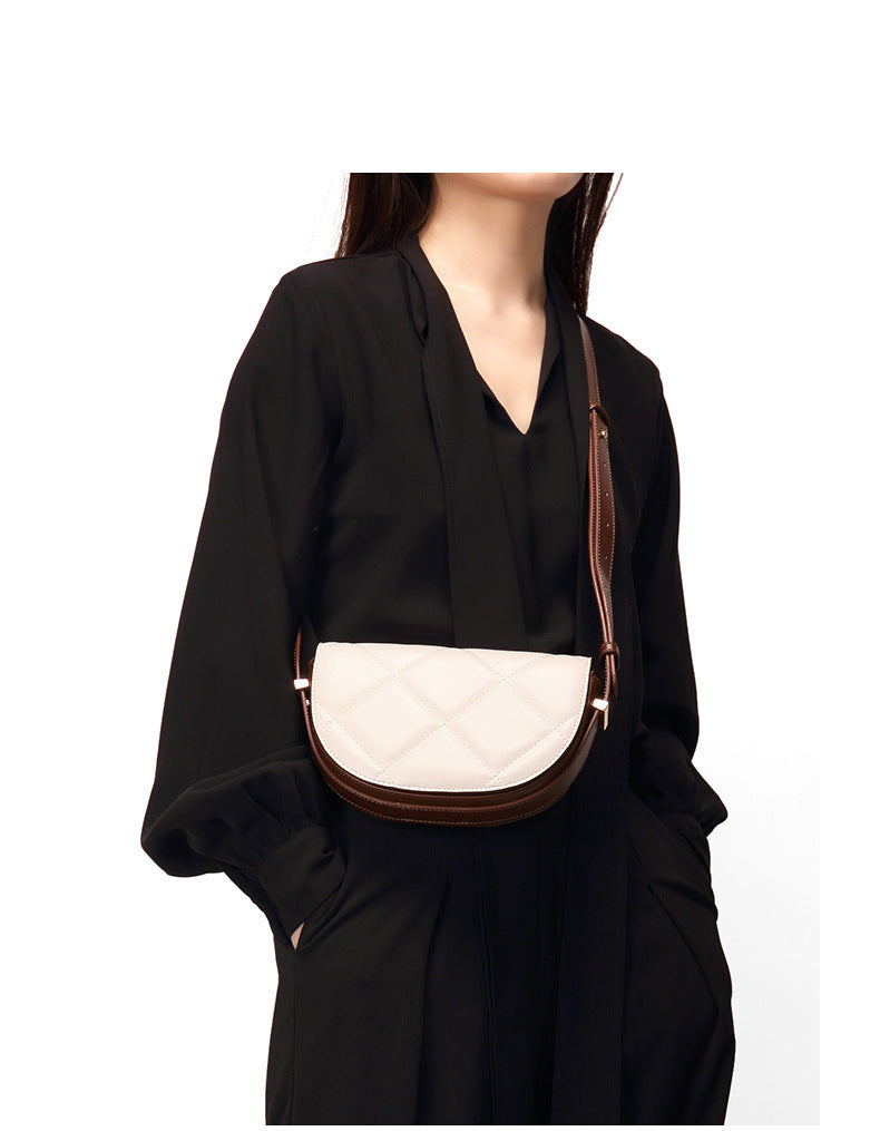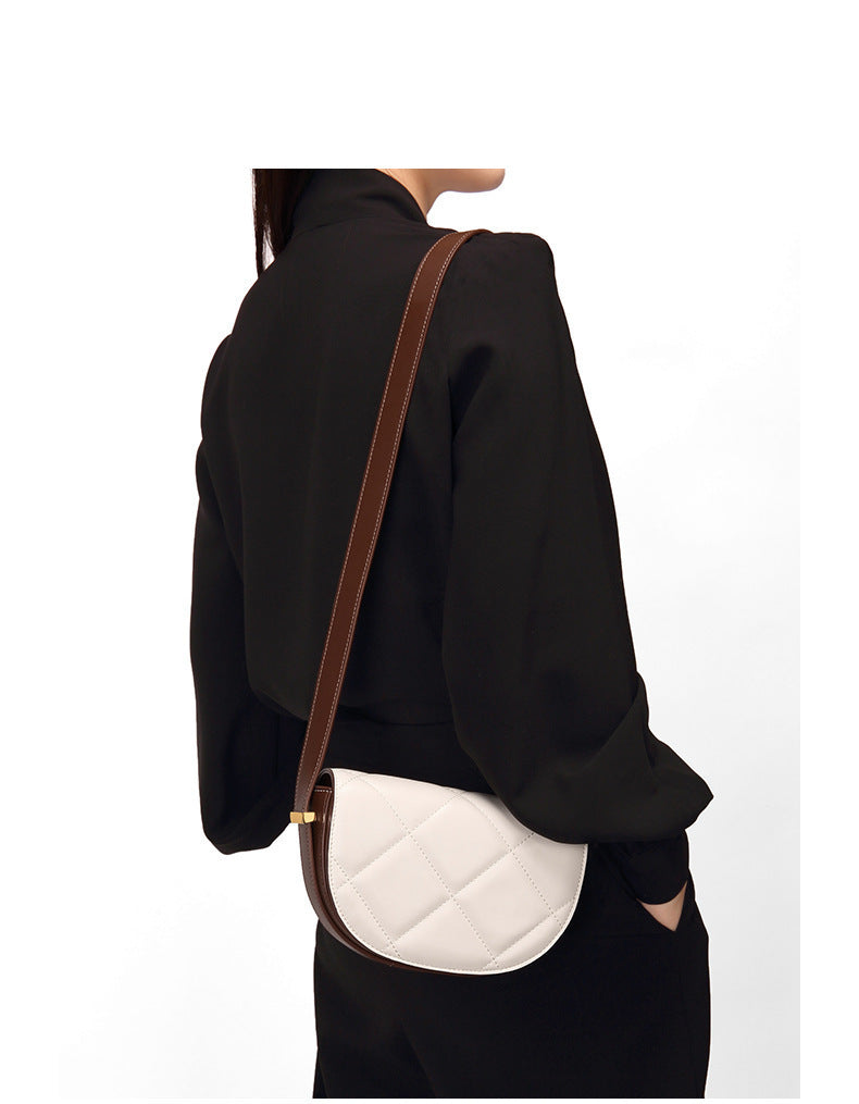 牛革女性バッグ高級感チェック柄斜め掛けバッグサドルバッグ本革半円ブロードバンドショルダーバッグ.ポシェット